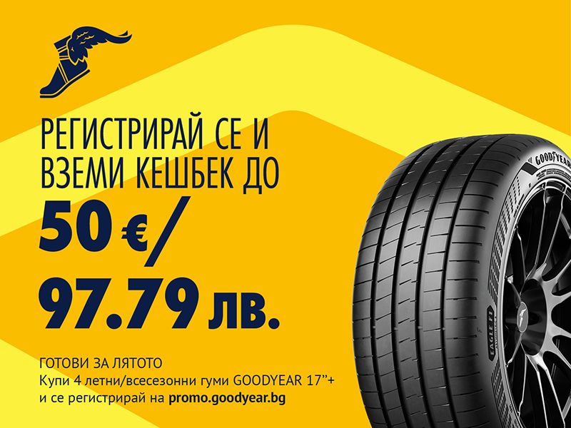ГОТОВИ ЗА ЛЯТОТО! Купи 4 летни/всесезонни гуми GOODYEAR 17''+, регистрирай се и вземи кешбек до 50 EUR / 97.79 лв!