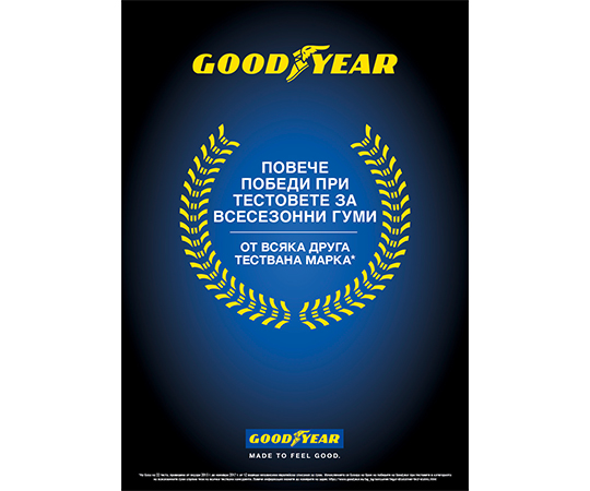*Базирано на 60 проучвания в списания от ноември 2013 г. до септември 2022 г., проведени от 17 от водещите и независими европейски списания за гуми. Изчислението е базирано на броя на спечелените тестове на Goodyear в категорията за цяла година спрямо всички тествани конкуренти. Повече информация можете да намерите на адрес https://www.goodyear.eu/bg_bg/consumer/legal-disclaimer-test-claims/more-all-season.html.