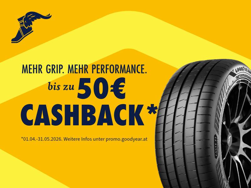 Bereit für Ihren Cashback? Kaufen Sie einen Satz Sommer- oder Ganzjahresreifen der Marke Goodyear und erhalten Sie bis zu 50 € Cashback.
