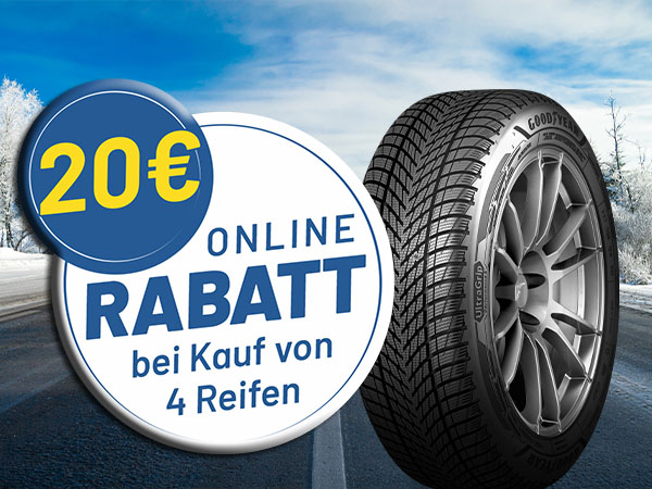 20€ Rabatt beim Kauf von 4 Ganzjahres-, 4 Sommer- oder 4 Winterreifen der Marke Goodyear im Online-Shop bis zum Dezember 2025 mit Montage bei einem unserer Partner.