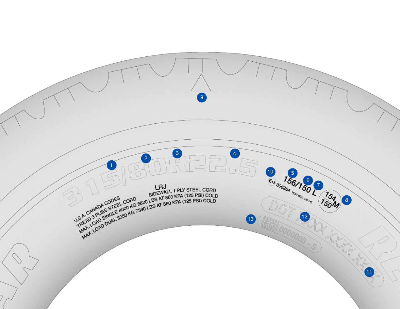 A truck tyre’s sidewall markings tell everything about that tyre. They describe exactly the size of the tyre, its construction and its performance limits. Much of this is statutory information and has to meet international requirements.