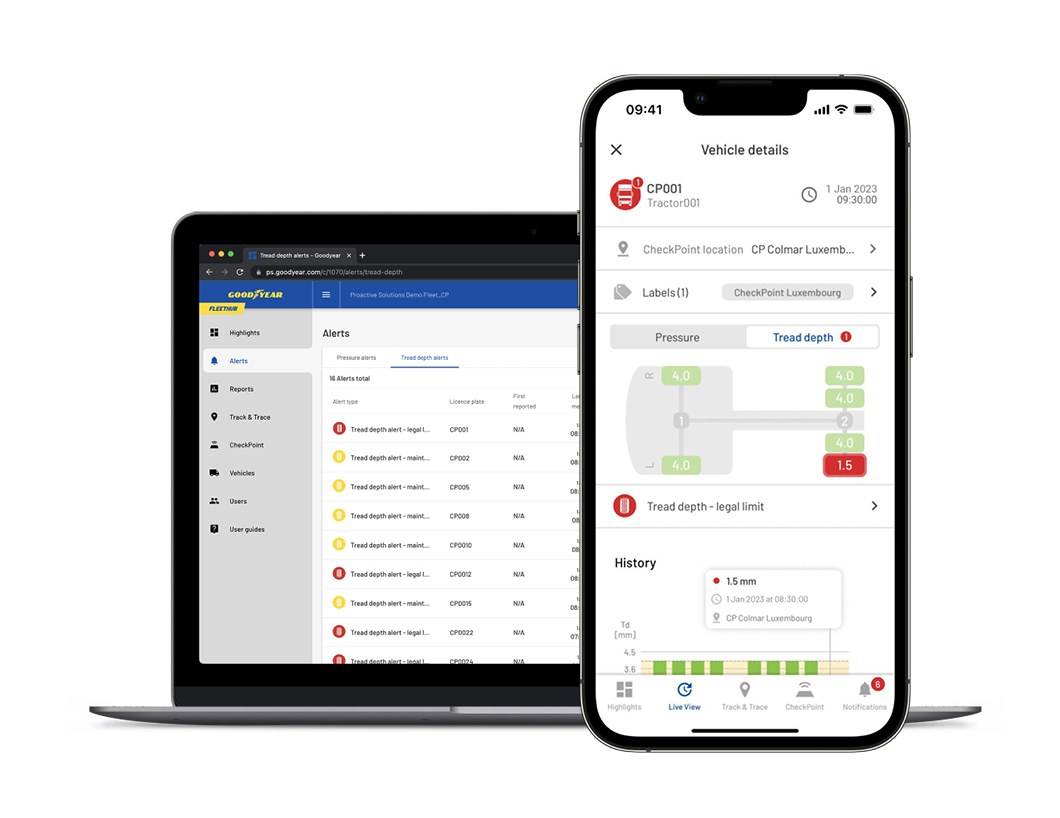 Goodyear CheckPoint lisää ajoneuvojen ajoaikaa. Se kertoo tarkasti kunkin renkaan tilanteen ja voit ryhtyä toimiin ongelmien ehkäisemiseksi. Ajoneuvokantasi pysyy liikkeessä – turvallisesti ja tehokkaasti.
