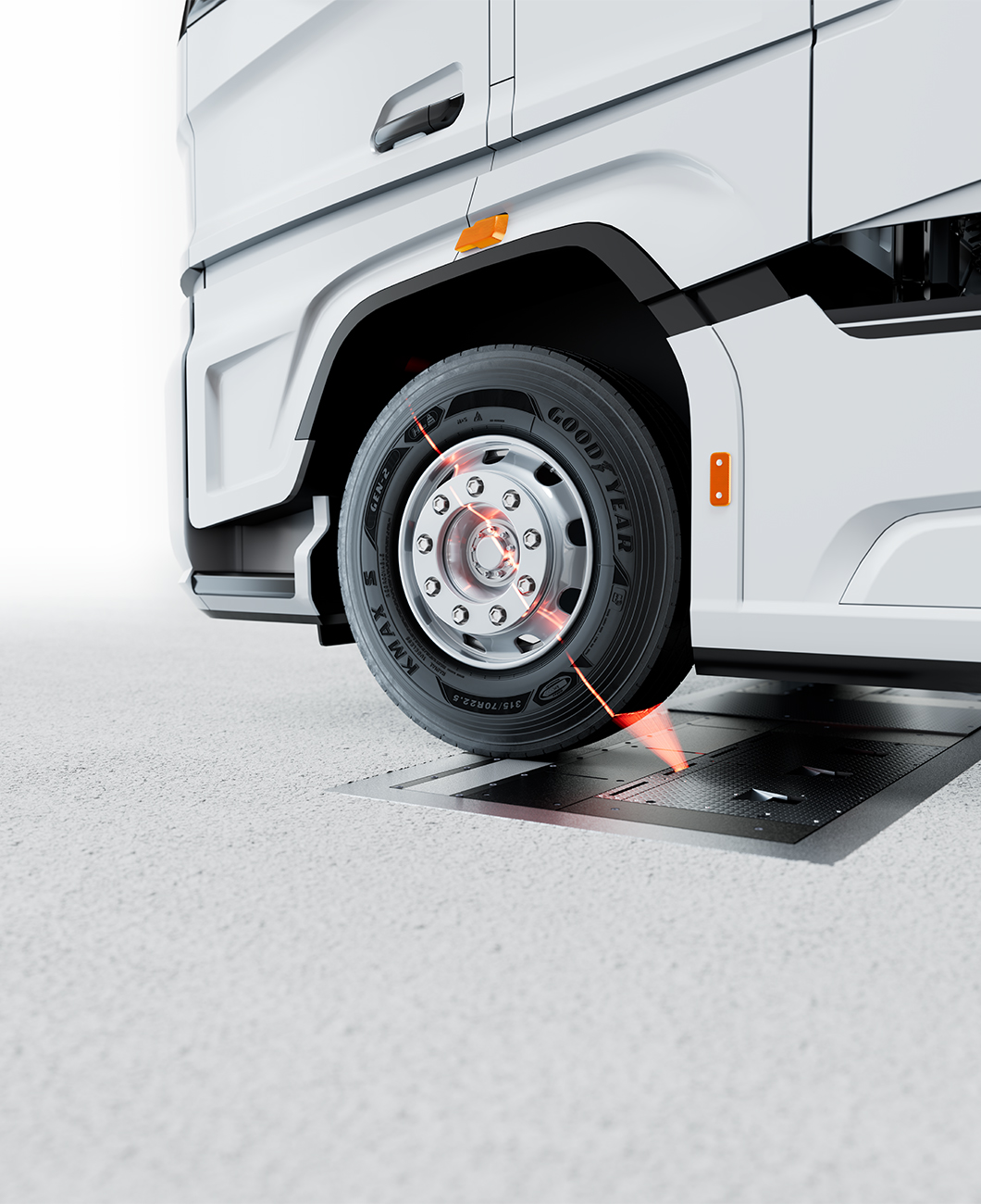 Goodyear CheckPoint lukee rengastiedot maahan asennetulla levyllä, jossa on kehittyneitä kameroita, lasereita ja antureita, kun ajoneuvo kulkee sen päältä. Edistyksellinen tekniikka tulkitsee tiedot hetkessä – saat tarkat mittaustulokset rengaspaineesta, jäljellä olevasta urasyvyydestä, akselipainosta* ja ajoneuvon kokonaispainosta*.