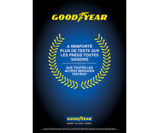 *D'après 33 tests comparatifs menés de janvier 2013 à décembre 2018 par 13 magazines automobiles indépendants leaders du marché européen. Ce calcul est basé sur le nombre de tests où Goodyear arrive en tête dans la catégorie pneus toutes saisons par rapport à tous les pneus concurrents testés. Pour en savoir plus, consultez le site https://www.goodyear.eu/fr_be/consumer/legal-disclaimer-test-claims/more-all-season.html.