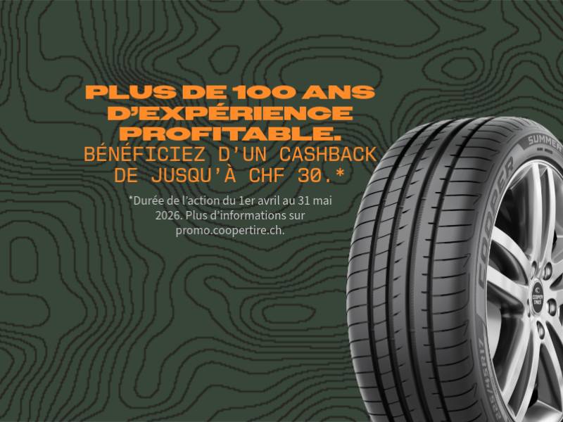 Êtes-vous prêt à recevoir votre cashback ? Achetez un jeu de pneus d'été ou toutes saisons de Cooper et recevez un cashback de jusqu'à CHF 30.-. Enregistrez-vous sur le site et bénéficiez d'un cashback.