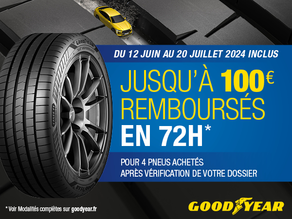 Entre le 12 juin et 20 juillet 2024 inclus, pour l’achat simultané et le montage de 2 ou 4 pneus de 15 pouces et plus de marque Goodyear des gammes Tourisme, 4x4, V.U., été, 4 saisons ou hiver, porteurs de l’offre, dans un des points de vente participant ou sur le site internet d’un point de vente participant à l’opération, vous pourrez bénéficier d’un remboursement par virement bancaire, pouvant aller jusqu'à 100€ !