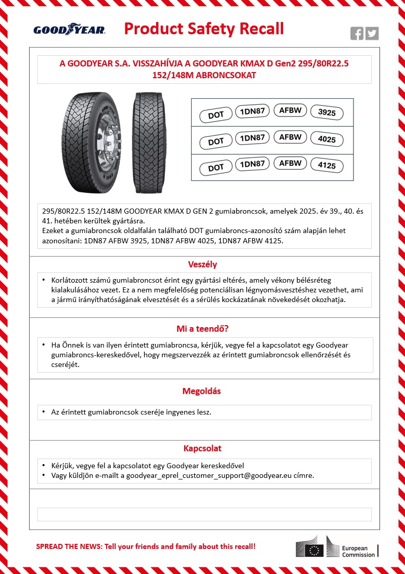 A Goodyear biztonsági visszahívást kezdeményezett a: