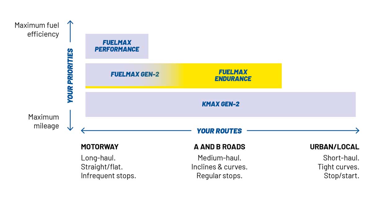 Questa è la sfida che abbiamo voluto risolvere con il design della nuova famiglia di pneumatici FUELMAX ENDURANCE. Questi pneumatici si caratterizzano per una bassa resistenza al rotolamento, favorendo un risparmio di carburante ed una riduzione delle emissioni. Sono, inoltre, perfettamente adatti alle strade statali e secondarie - garantendo chilomtraggio e trazione necessari per gestire le applicazioni in diverse tipologie di strada.