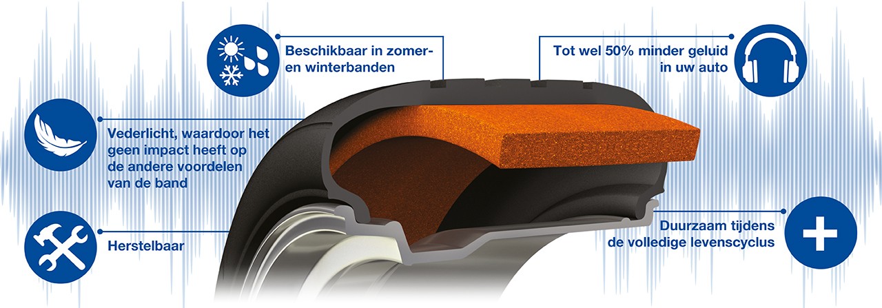 De SoundComfort-banden zijn voorzien van een polyurethane schuimlaag aan de binnenkant van de band die zorgt voor veel stiller en comfortabeler rijgedrag door het interne geluidsniveau van uw voertuig tot wel 50% (4db)* te verminderen.