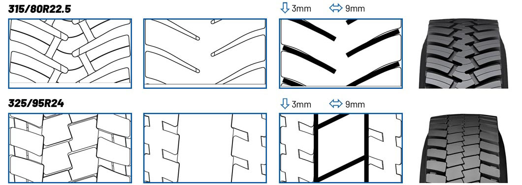 > Jevn slitasje i flise- og blokkeforhold, stort potensial for kjørelengde og beskyttelse av dekkstammer.