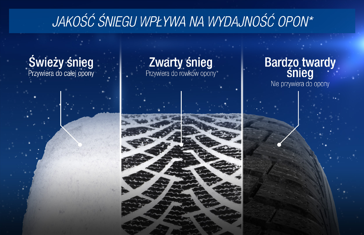 Jeśli samochód jedzie po świeżym, sypkim śniegu, opona jest całkowicie pokryta śniegiem. Zwarty śnieg pozostaje w rowkach bieżnika. Bieżnik jest czarno-biały. Jeśli śnieg jest już twardy i ubity, nie przykleja się do bieżnika, a opona pozostaje czarna. Na interakcję śniegu z oponą wpływają również inne czynniki, takie jak temperatura powietrza i prędkość.