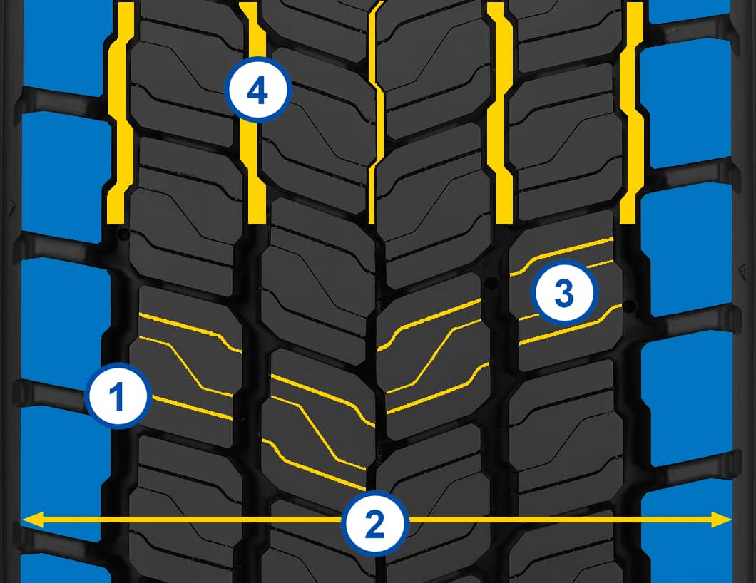 Um pneu de transmissão para ônibus especializado para condução durante o inverno, que oferece uma aderência fiável em gelo e neve, combinada com uma excelente quilometragem.