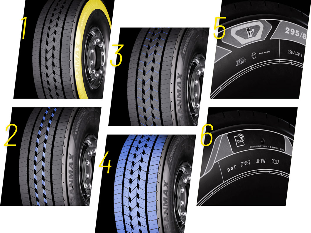 Um pneu de eixo de transmissão para autocarros com paredes laterais reforçadas concebido para percursos urbanos e que oferece tração adicional para utilização no inverno.
