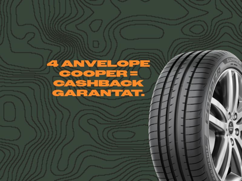 Ești gata să primești cashback? Cumpără un set de anvelope Cooper 17"+ de vară sau all season (anvelope pentru turisme sau camionete) între 1.04 și 15.05.2026 inclusiv, înregistrează-te pe site și beneficiezi garantat de cashback de până la 200 RON.