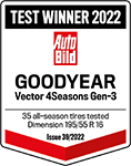 * Výsledky testov časopisu Auto Bild 2022, 2021 a 2020 ukázali, že pneumatika Goodyear Vector 4Seasons Gen-3 ponúka najvyšší počet najazdených kilometrov v kategórii celoročných pneumatík v porovnaní s poprednými testovanými značkami pneumatík (popredné testované značky pneumatík boli definované podľa podielu na trhu v Európe).